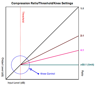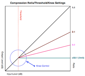 Some compressors have an option to adjust the speed at which the signal is compressed to the set compression ratio as it exceeds the threshold. A ‘hard’ knee abruptly kicks in; a ‘soft’ knee setting is more gradual and results in a less obvious transition from input signal to compressed output. Some compressors have their own terminology for the ‘knee’ function – dbx’s softer knee circuit is named ‘OverEasy.’