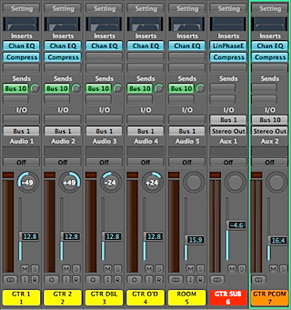 • SubMix channels: Useful for controlling. processing and maybe automating your guitars. Instead of outputting your tracks to the mix bus, route them to a new bus and bring that bus up on new track(s). Now you can add additional processing (see the compression section below) or add the final touches to get them sounding right. Pan to taste – although I often prefer to not use extreme L-R, but instead narrow the stage slightly – your material will determine the best choice. Experiment with adding a really fast delay to one side, returning to the other, with different EQ.